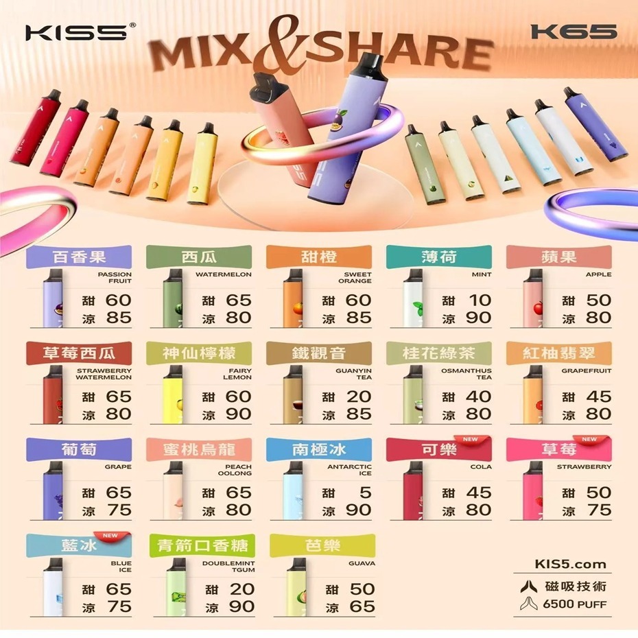 KIS5 凱斯一次性不僅在口感上創新,還擁有高質量的成分和獨特的磁吸設計,帶來時尚與便捷的完美結合。每一款口味均使用經過嚴格把控的安全成分製作,確保吸食時的順滑和純粹的味道。