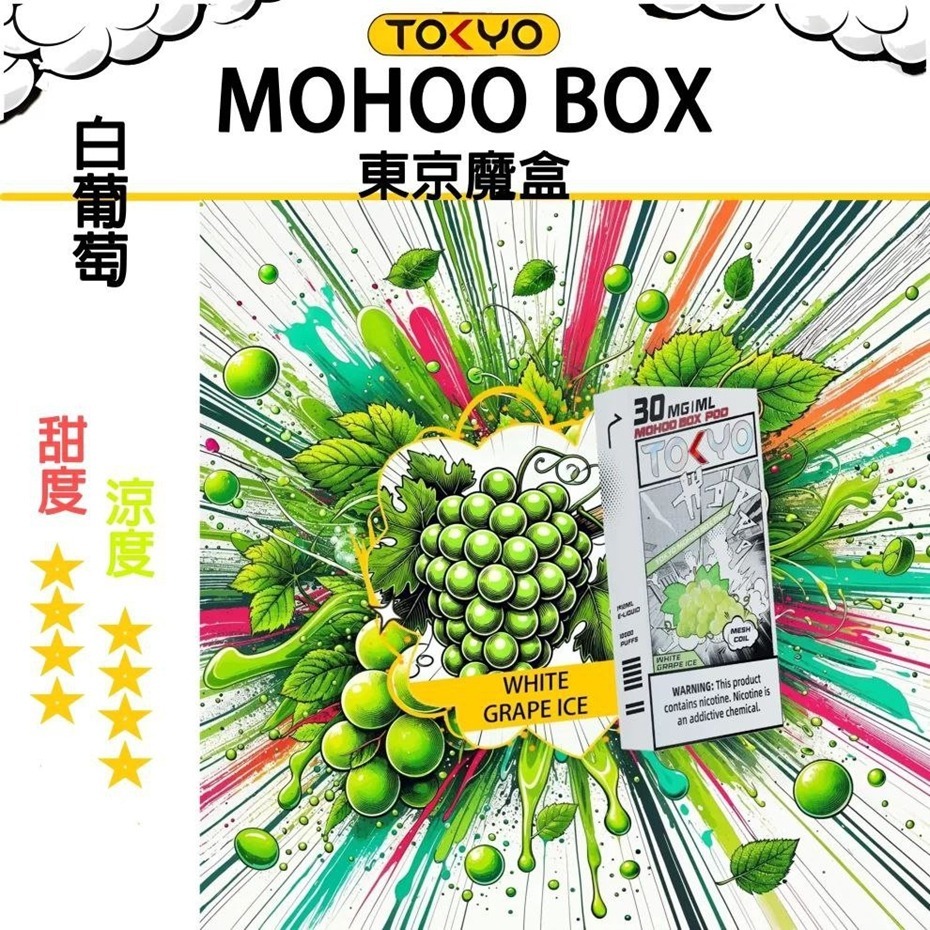 東京魔盒煙油 30mL,Tokyo Mohoo 原裝小煙油,提供 15 款經典口味:可樂、葡萄、荔枝、芒果、薄荷、龍井茶等。採用高品質尼古丁鹽配方,口感濃郁順滑,完美搭配 Pod 與注油式設備,帶來純正電子煙體驗。